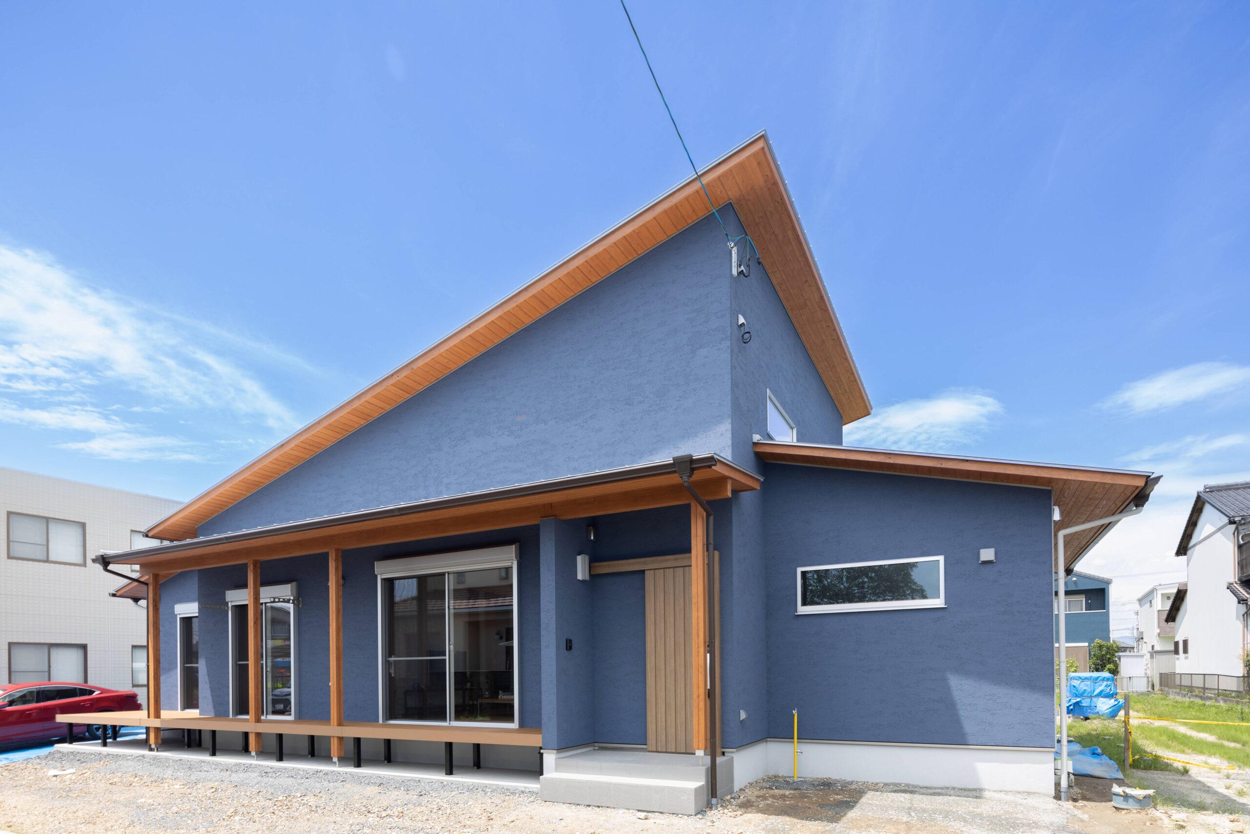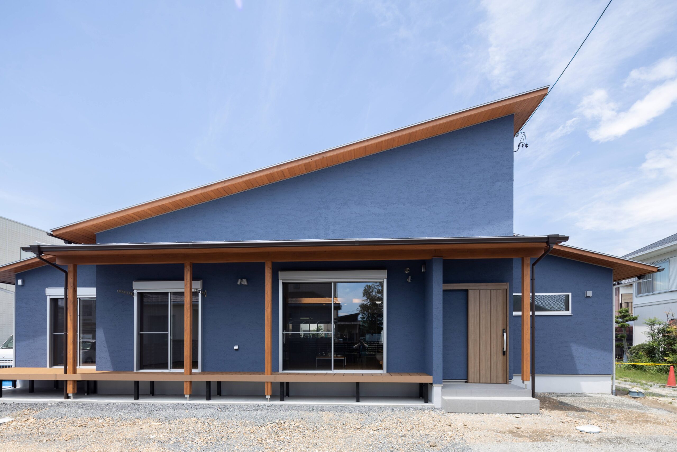素材は、ネイビーのジョリパット仕上げです。木目と塗り壁のコントラストが美しい外観デザインです。