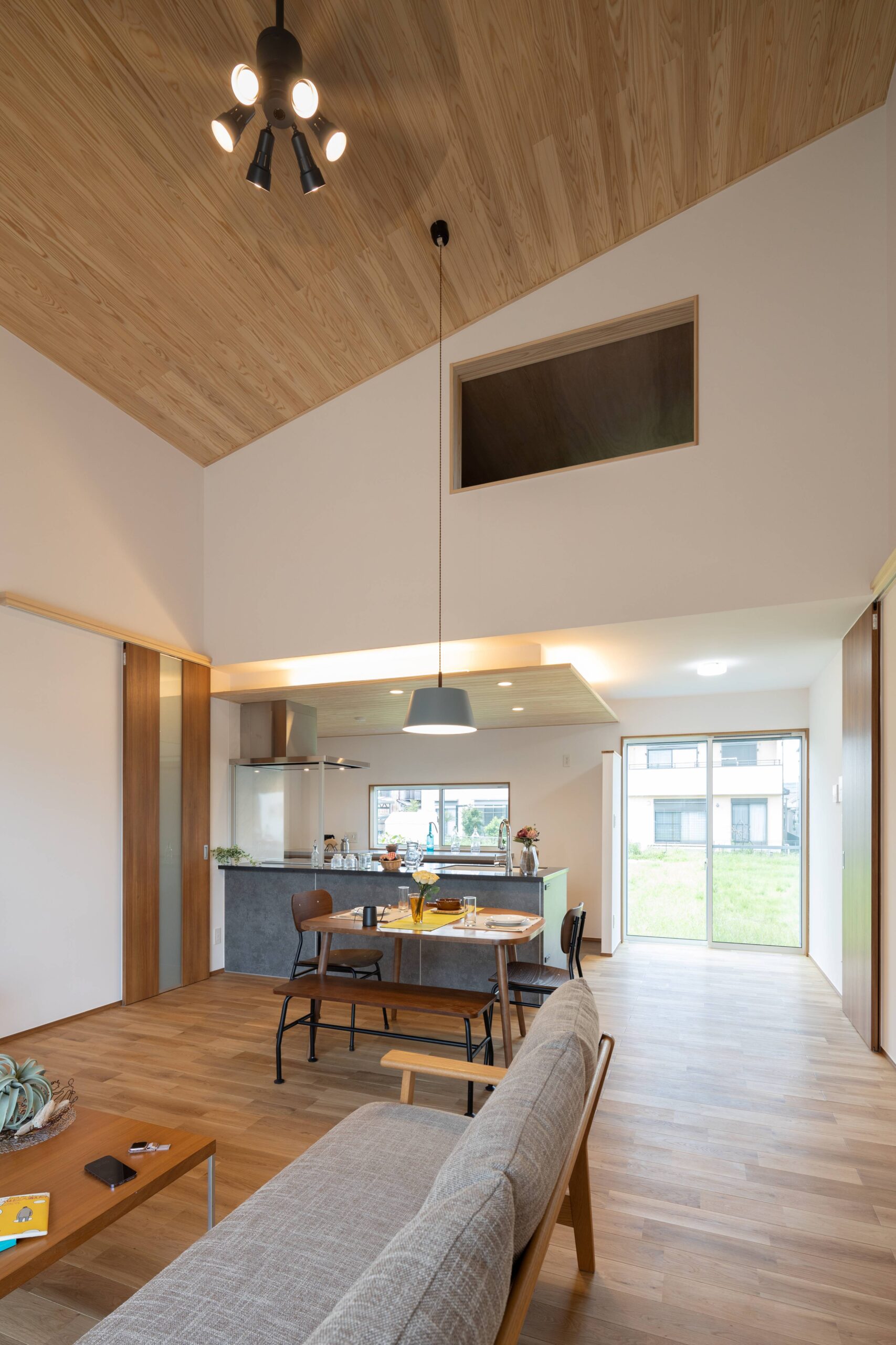 片流れ屋根の形状を活かした、勾配天井のリビングです。平屋でも吹抜けのような広々とした空間を作ることができます。