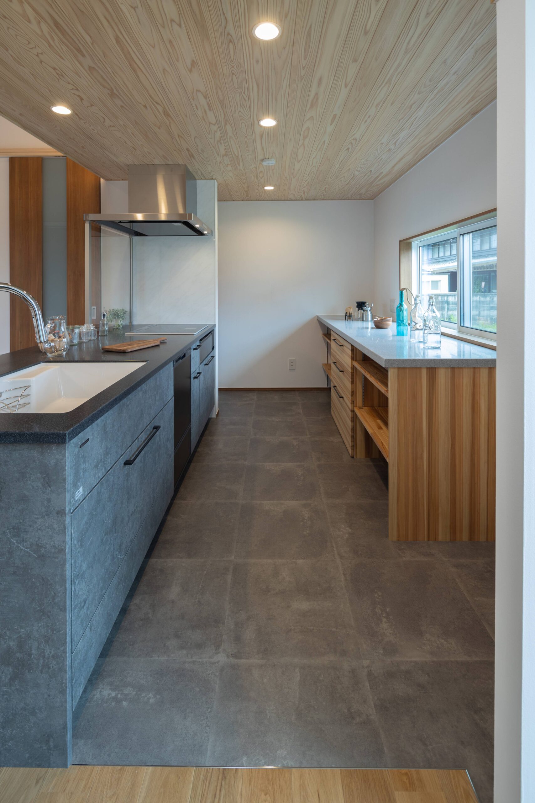 下がり天井で、杉の板張りを採用しました。リビングの天井高が高いので圧迫感はなく、メリハリのある空間を演出します。
