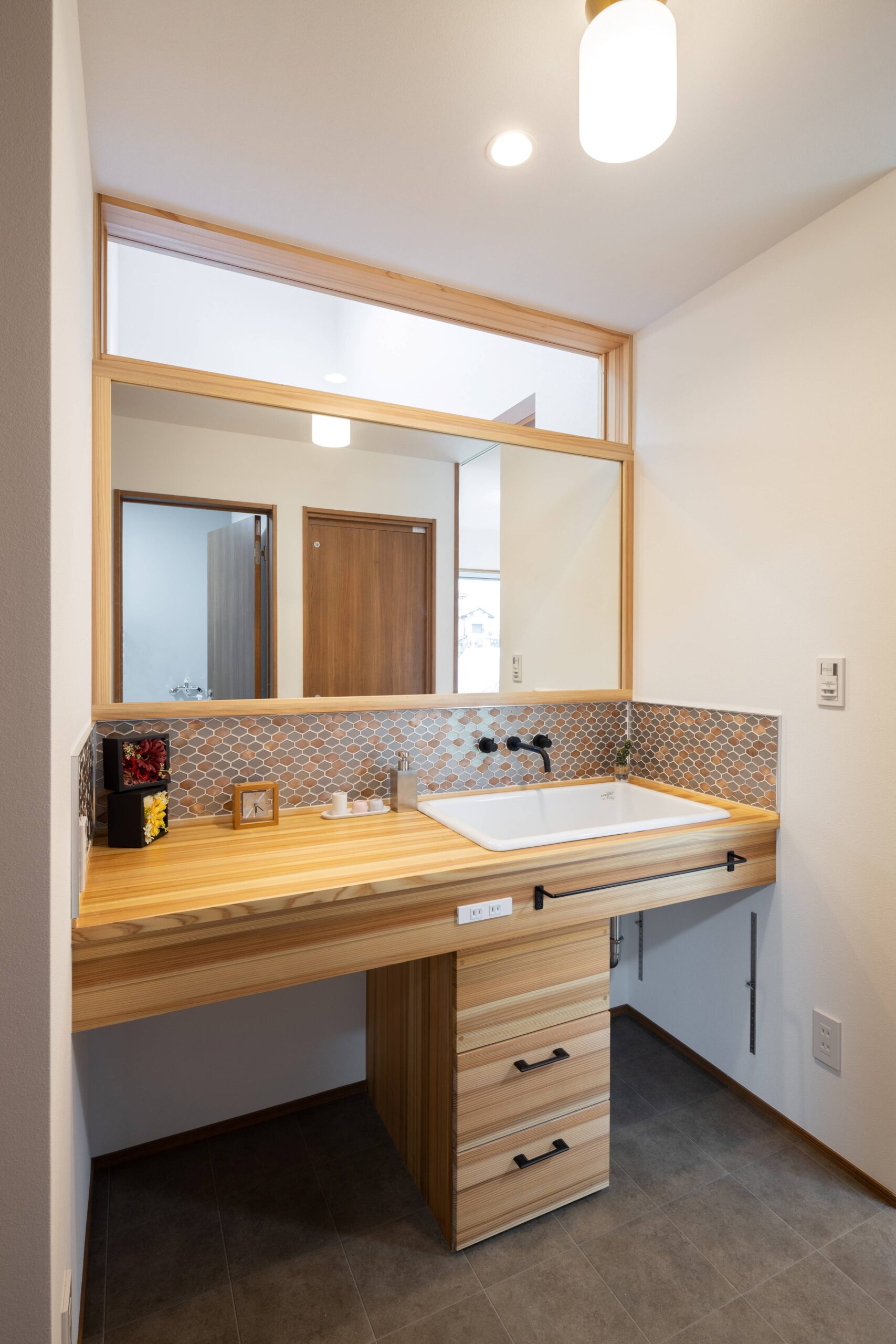 オリジナルで作成した洗面台です。洗面の幅はおおよそ1.7mあり、2人並んでも広く、朝支度の混雑も回避できます。上部の開口は、玄関ホールに繫がり自然の光も十分に取り込める洗面です。