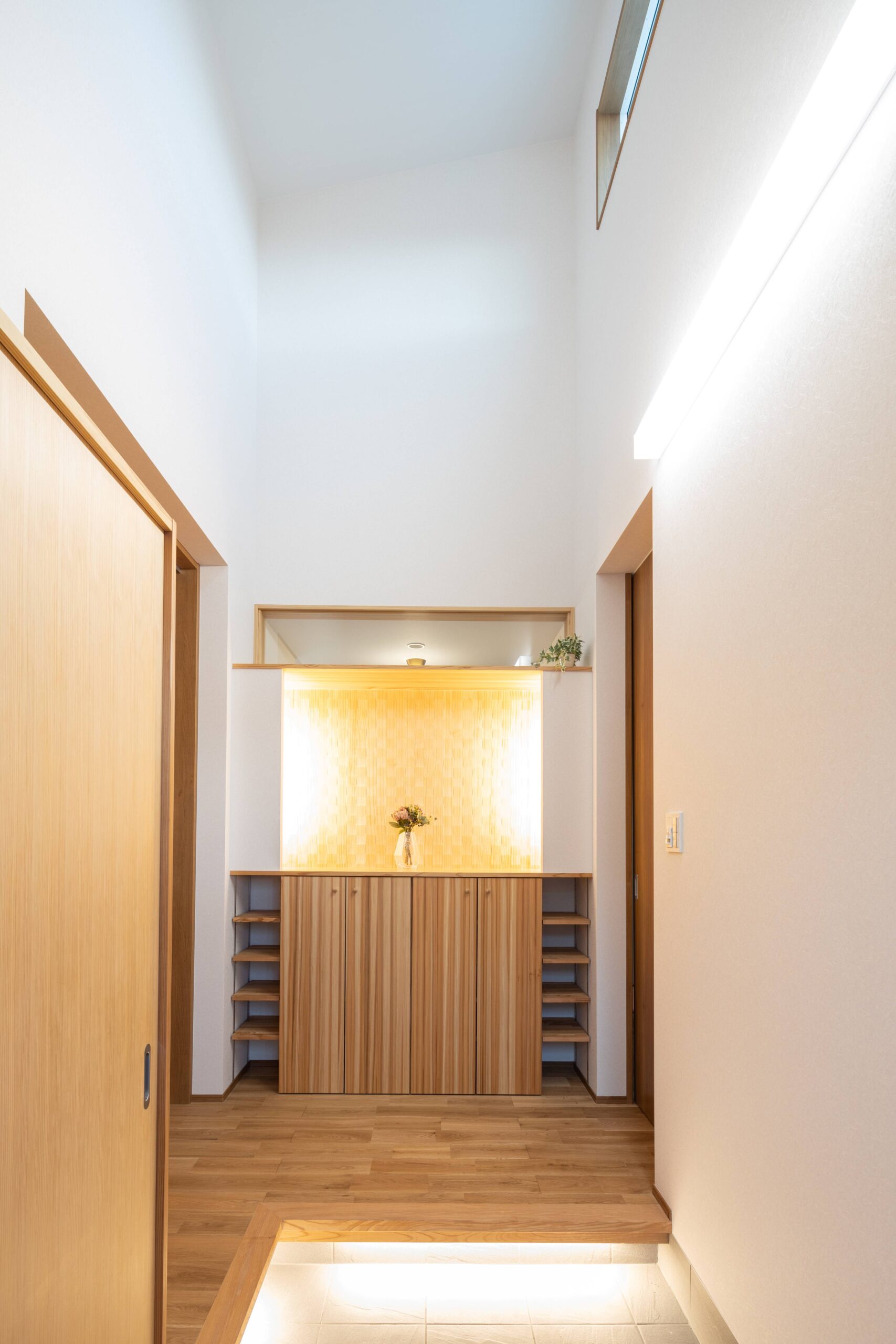 間接照明の柔らかい光が、帰宅時の安心感をあたえてくれます。左手にはご家族のLDK、右手はセカンドリビングに繫がり玄関からプライベート空間を仕切る設計となっています。