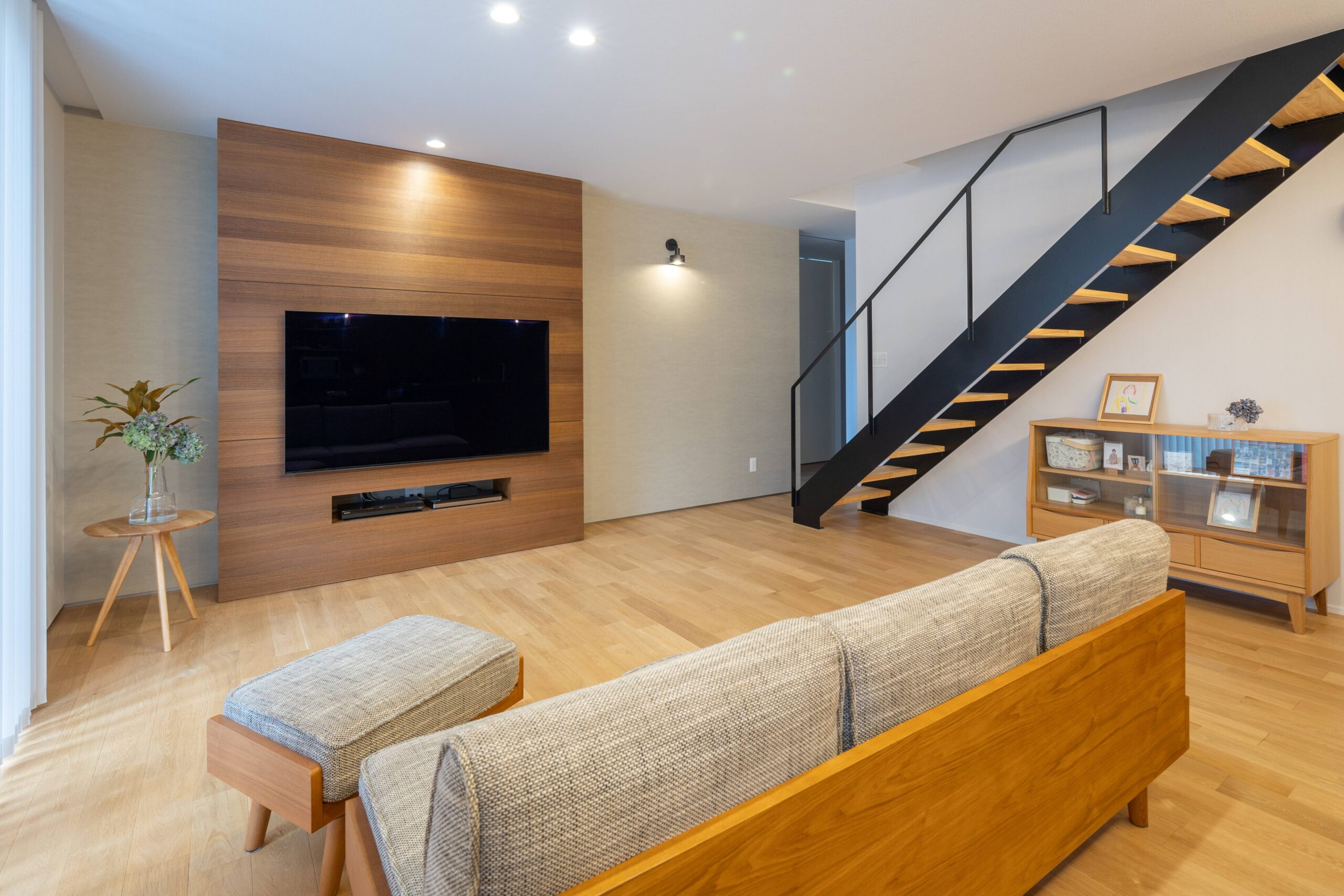 テレビ後ろは、アクセントで板張りにしております。