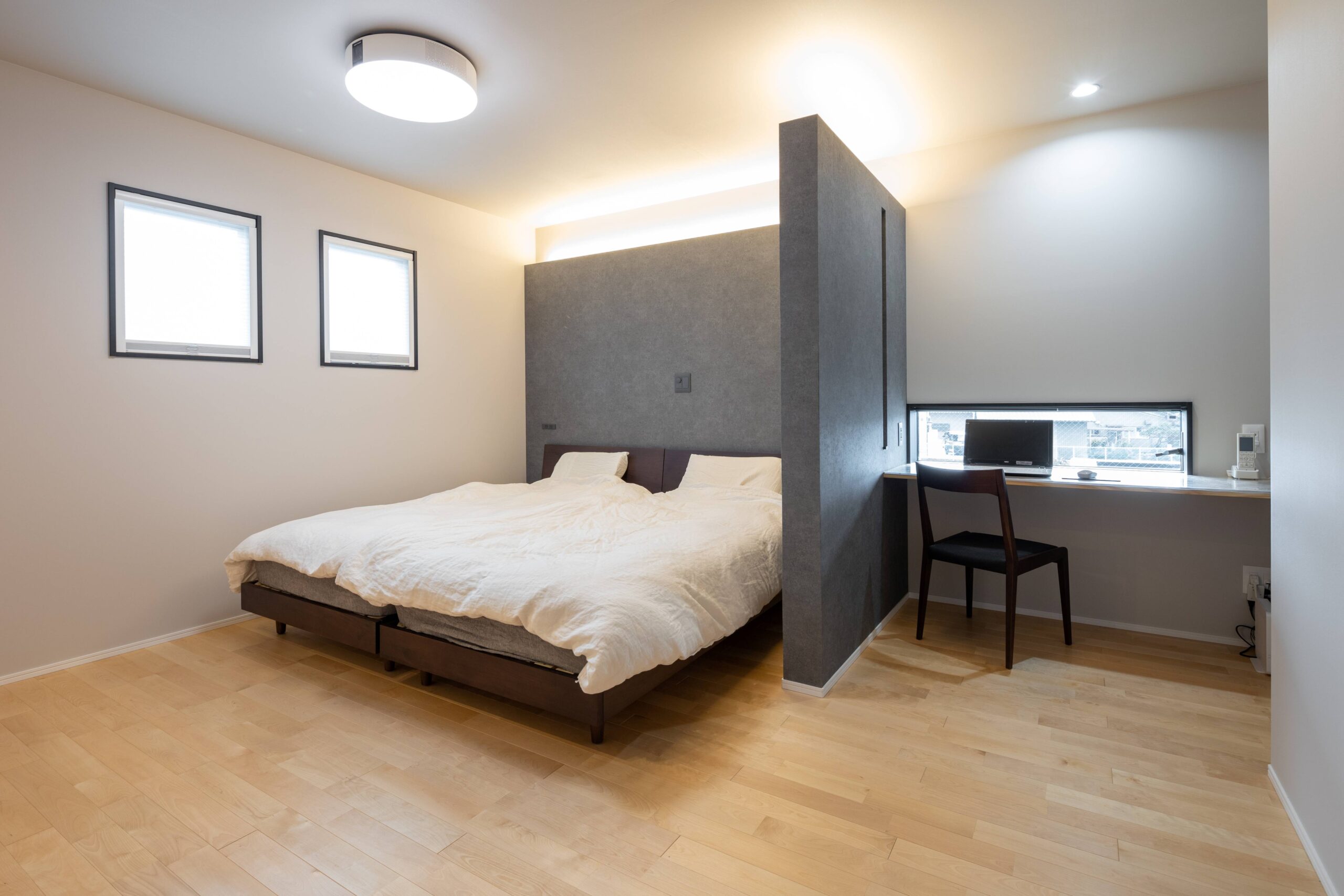 寝室に書斎があるシンプルモダンな家