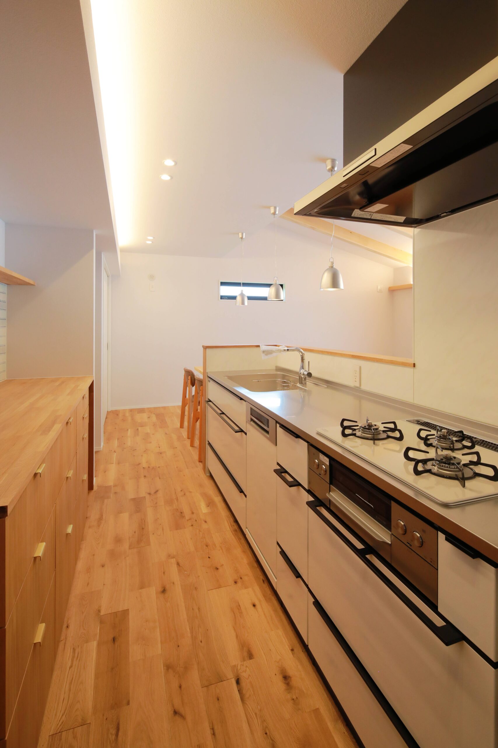 カップボードは造作で、床材と合わせたナラ材を採用しました。