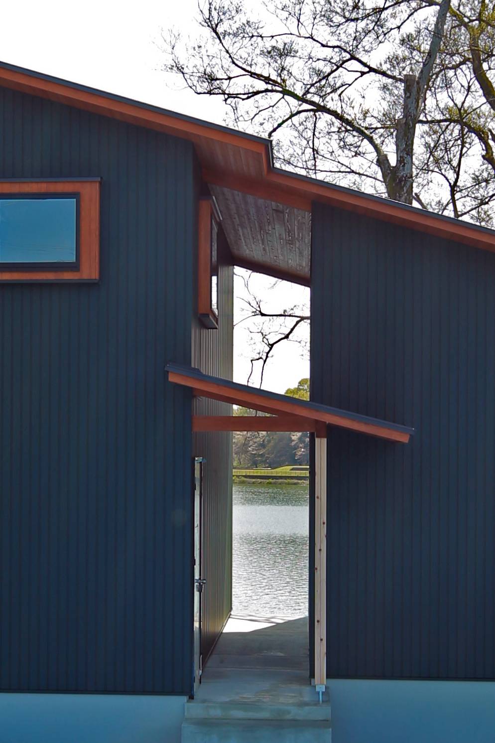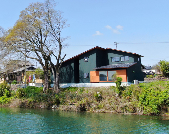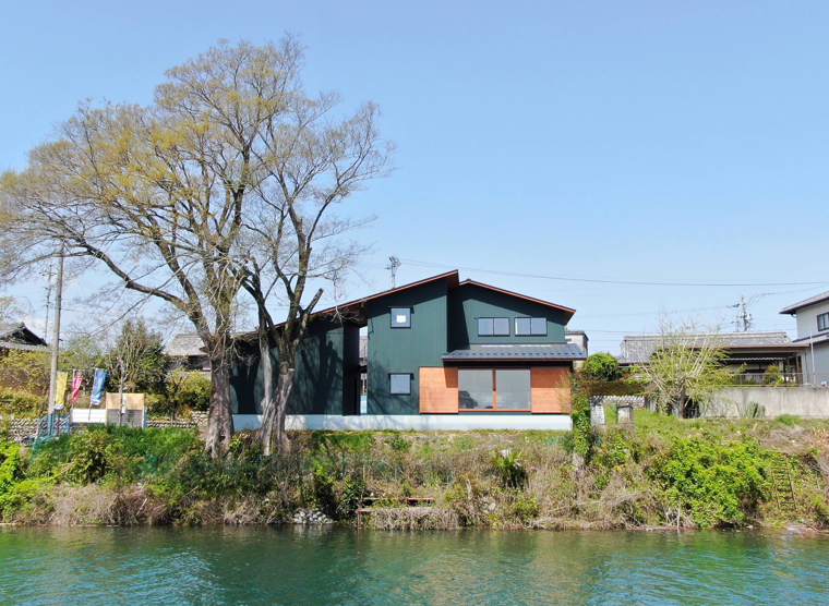 モスグリーンのガルバリウム鋼板に木目が映える外観デザインとなっています。